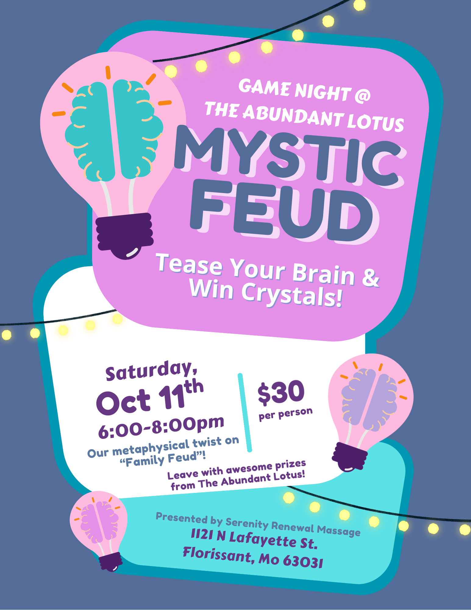Join us for our regular Lotus Game Nights! This time we are playing Mystic Feud! A metaphysical twist on the classic game show Family Feud. Compete in teams to guess the most popular answers to fun & mystical questions. This night will be full of laughter, friendly rivalry, & magical vibes. Come solo or bring a friend for your chance to win awesome prizes from The Abundant Lotus!
