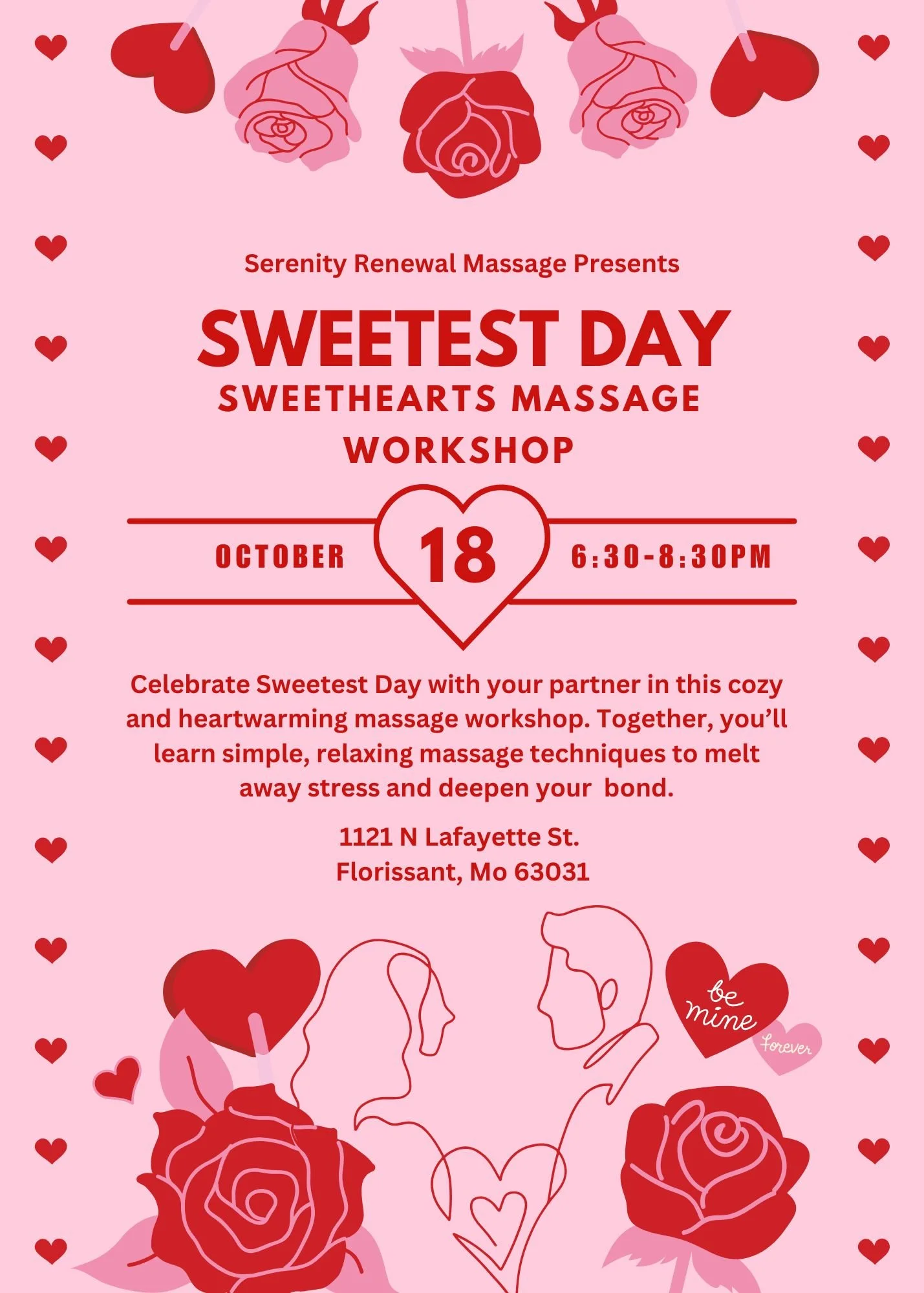 Celebrate Sweetest Day with your partner in this cozy and heartwarming massage workshop. Together, you’ll learn simple, relaxing massage techniques to melt away stress and deepen your bond. Leave feeling refreshed, connected, and confident in using these techniques at home. Only one booking per couple is needed.